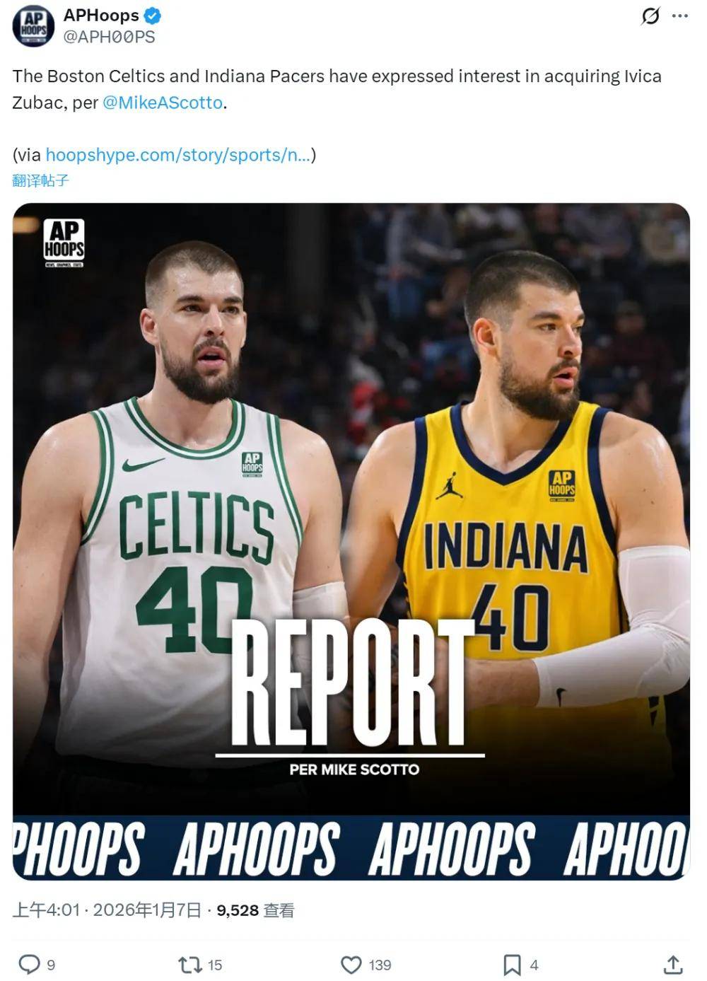 对于吃到闭门羹的青睐者,并没有放弃,而是把交易目标从哈登,转移到了首发中锋祖巴茨的身上。这位克罗地亚球星,本赛季场均贡献15分11篮板2.5助攻,投篮命中率达到60%,如此逆天的发挥引得多支球队争相追逐,而24年的总冠军得主波士顿凯尔特人,对祖巴茨展开激烈的追逐。总经理史蒂文斯愿意放出豪瑟以及多个选秀权,得到这位即战力中锋,可是,上赛季的总亚军印第安纳步行者,也在努力找寻埃文特纳的替代品,管理层已经锁定了祖巴茨。