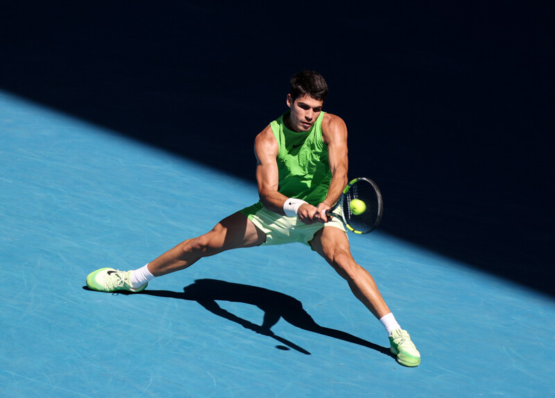 新华社照片,墨尔本(澳大利亚),2026年1月30日 1月30日,阿尔卡拉斯在比赛中回球。 当地时间1月30日,在墨尔本进行的2026年澳大利亚网球公开赛男单半决赛中,西班牙选手阿尔卡拉斯3比2战胜德国选手兹维列夫,晋级决赛。 新华社记者 马平 摄